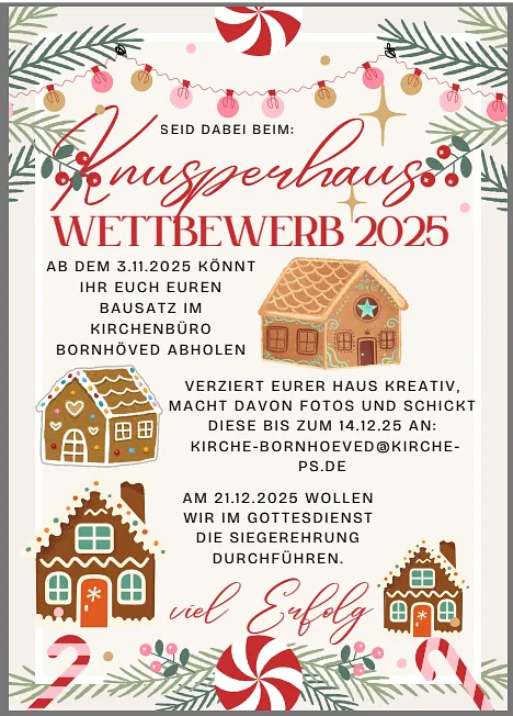 Teilnahmebedingungen: Das Haus aus dem Bausatz muss erkennbar bleiben - alles andere an Dekoration oder Umgebung darf frei und nach eigenem Geschmack gestaltet werden. Es sollten zwei bis drei Fotos des fertigen Hauses per E-Mail im Kirchenbüro (kirche-bornhoeved@kirche-ps.de) eingereicht werden, damit die Jury daraus den Gewinner ermitteln kann. Bitte schreibt Eure Telefonnummer dazu, damit wir Euch in jedem Fall erreichen können.